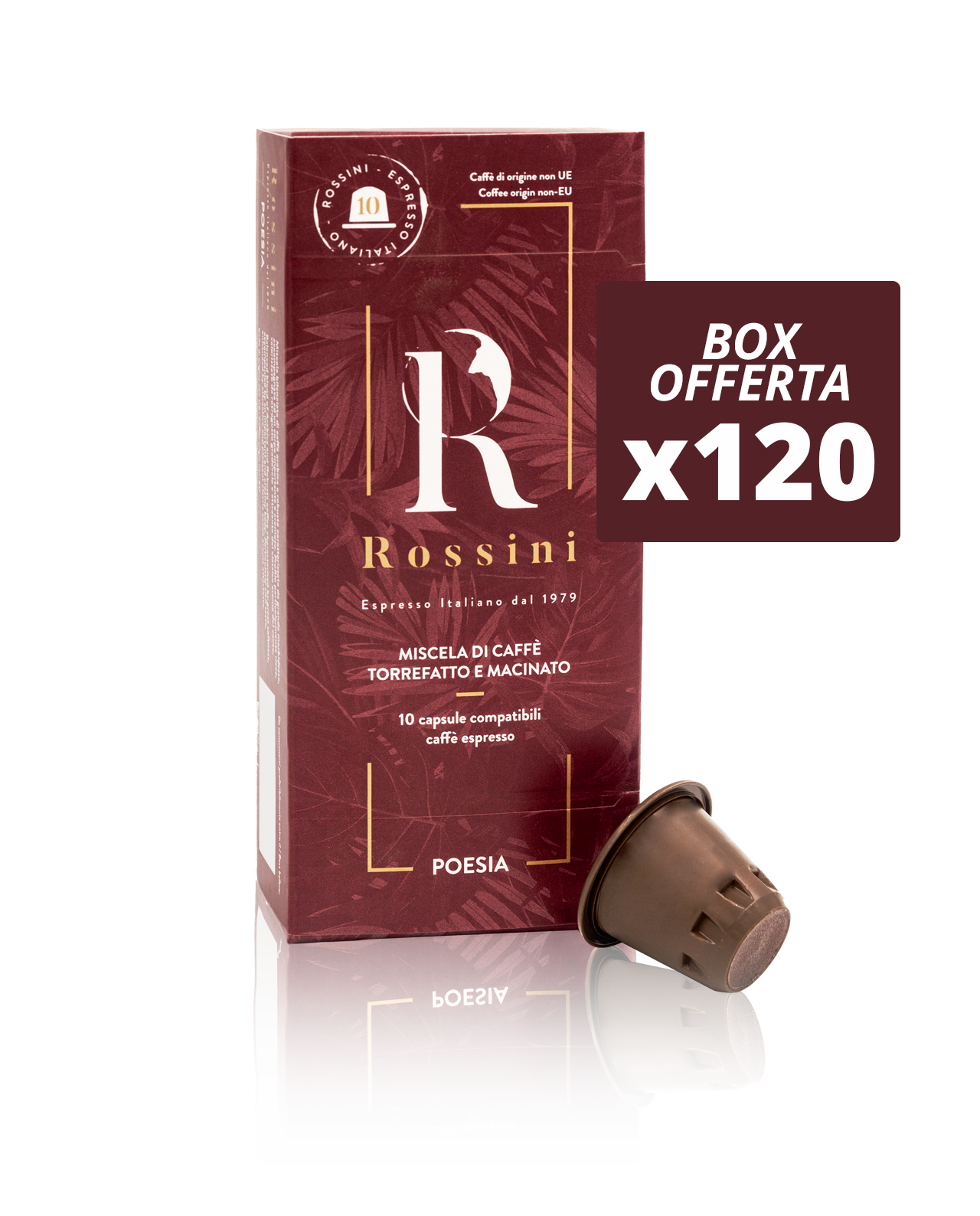 Poesia coffee blend selected by hand, and hand-roasted. Packaged in 5 gram self-protected capsules, compatible with Nespresso® * machines for domestic use: Citiz, Pixie, Essenza, Lattissima, U, Maestria, Inissia.