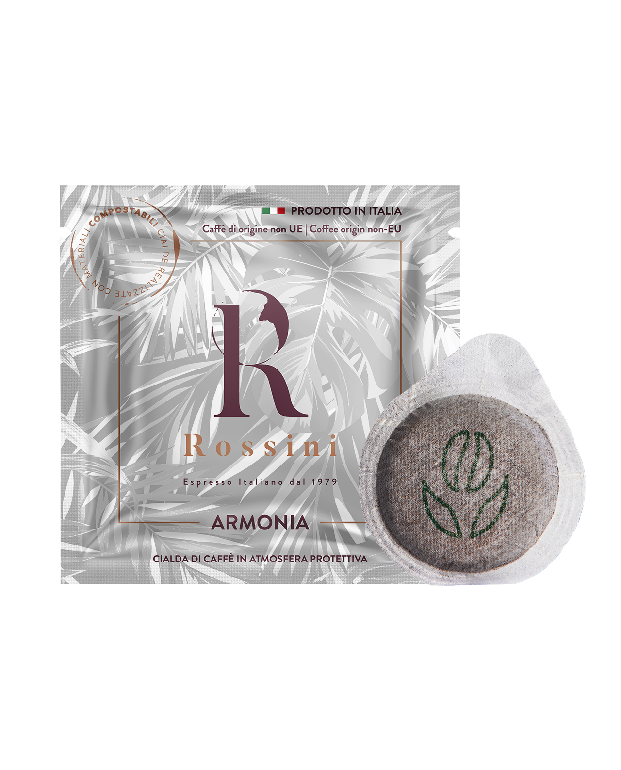 Armonia coffee blend selected by hand, and hand-roasted. Packaged in a compostable paper single-dose pod compatible with the ESE44 system in a protective atmosphere.