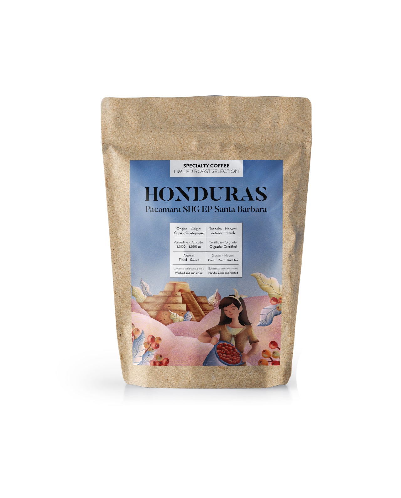 Honduras Pacamara is produced in the mountains of the Cordillera el Volcan and Guijo, located in the municipality of Trinidad at an altitude between 1,300 and 1,550 meters above sea level. Cherries ripen more slowly thanks to the shade of an Inga forest and fruit trees that characterize its notes in the cup.